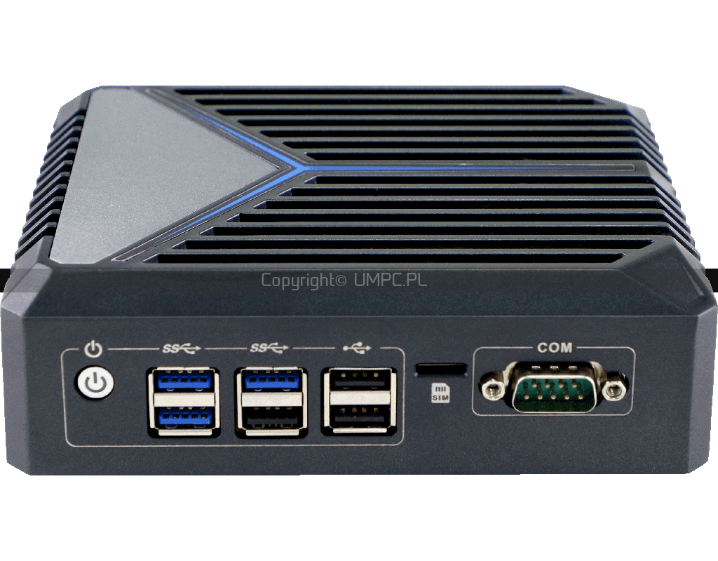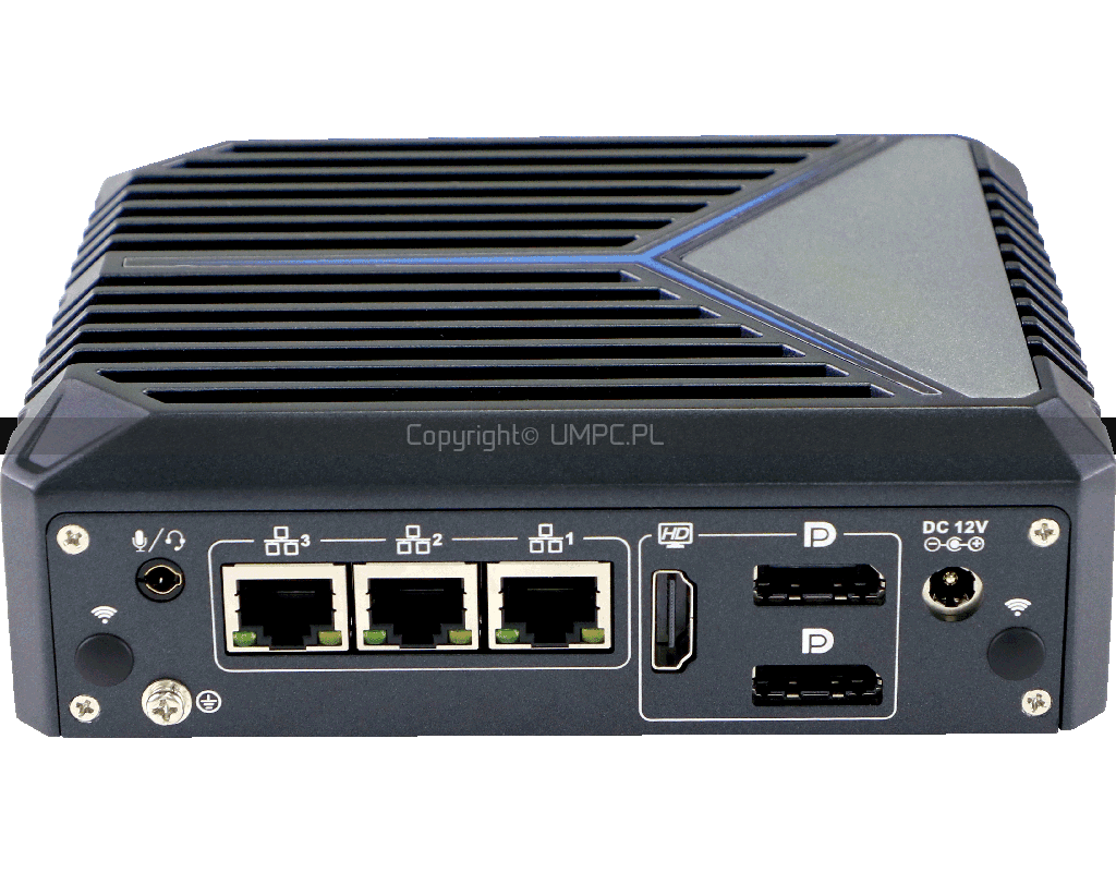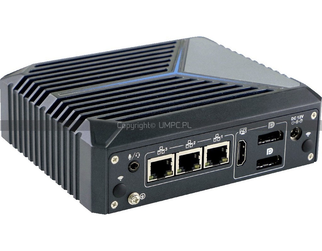 Kompaktowy bezwentylatorowy mini PC w aluminiowej obudowie. Trzy porty 2.5G LAN, sześć gniazd USB oraz dwa wyjścia DisplayPort 4K.