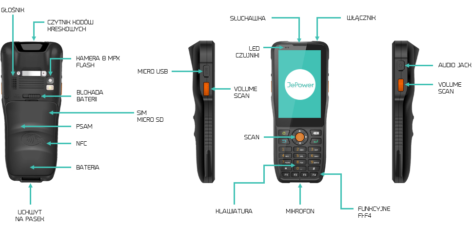 Jepower HT380K może służyć jako kolektor danych lub smartfon przemysłowy. Z łatwością przeprowadzisz rozmowy głosowe jak i wyślesz wiadomość tekstową. Funkcje multimedialne rozszerza gniazdo słuchawkowe, wbudowany mikrofon oraz głośnik. Ładowanie urządzenia odbywa się za pomocą portu micro-USB lub dedykowanej stacji dokującej. Ze względu na swoją przemysłową specyfikę bateria nie ulega wstrząsom, a dostęp do niej jest utrudniony przez przesuwaną blokadę. Do każdego zestawu dołączony jest materiałowy uchwyt, który usprawnia komfort użytkowania.